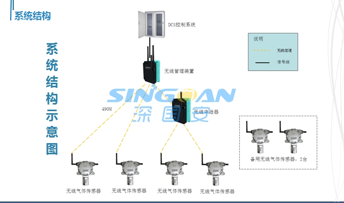 深國安電子的無線在線監(jiān)控系統(tǒng),利用無線傳感網(wǎng)絡(luò)技術(shù)搭建。選用無線管理裝置、無線氣體傳感器,采集電廠監(jiān)測點的氣體濃度數(shù)據(jù),通過無線傳輸方式上傳至無線管理裝置,無線管理裝置對收到的傳感接點傳來的數(shù)據(jù)進(jìn)行分析處理,在設(shè)備故障時和氣體濃度達(dá)到報警值時,將開關(guān)量告警信號信號上傳至GIS大樓DCS控制器系統(tǒng)處理,以便對各監(jiān)測點進(jìn)行安全監(jiān)控和極限報警處理。