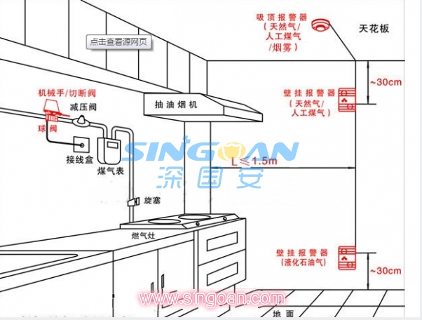 2. 適用于天然氣、人工煤氣的報警器,應(yīng)安裝于距頂棚小于30cm,距廚具大于1m小于8m的位置,如圖所示。