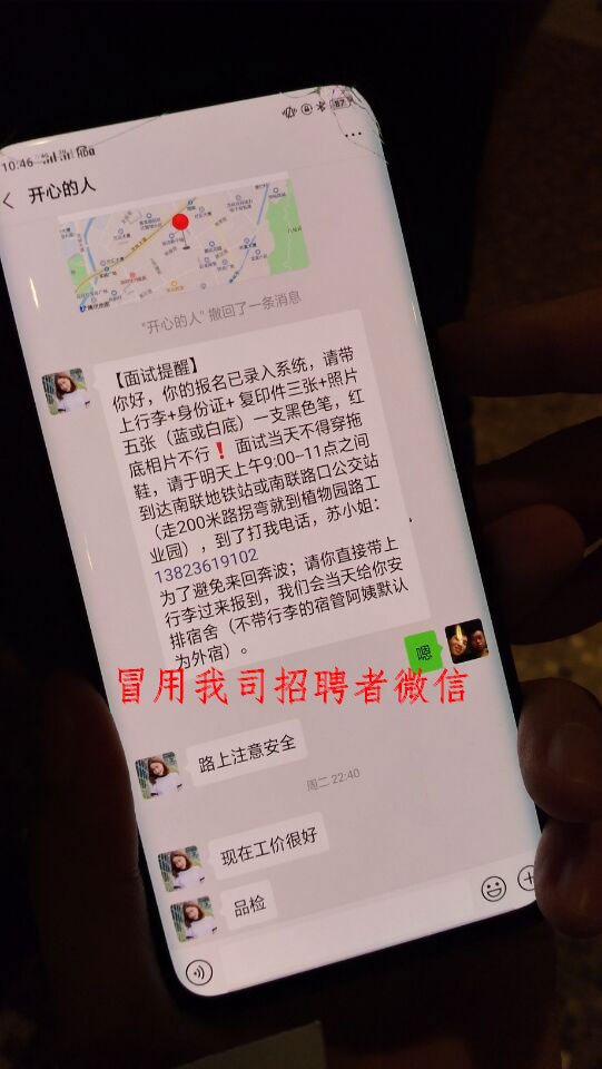 一、我公司人事部負(fù)責(zé)招聘的同事無(wú)“胡小姐”此人,我公司也未委托任何第三方招聘機(jī)構(gòu)的胡小姐進(jìn)行招聘,且我公司在招聘過(guò)程中不收取報(bào)名費(fèi)、中介費(fèi)、手續(xù)費(fèi)等任何費(fèi)用。